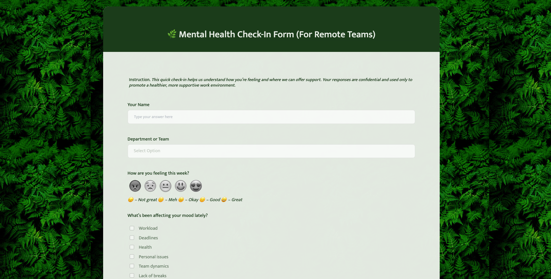 Working remotely can feel isolating—this mental health check-in form helps managers stay connected to how their team is really doing. It gives employees a safe space to share stress levels, mood, workload concerns, or burnout warning signs. No therapy questions—just a light, thoughtful way to promote mental wellness and start supportive conversations. Ideal for HR teams, people managers, or team leads looking to build a healthier remote culture. Easy to customize and use regularly or as needed.